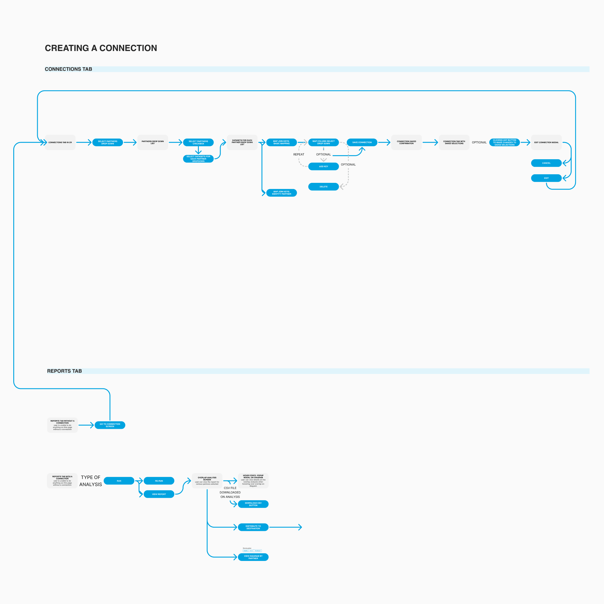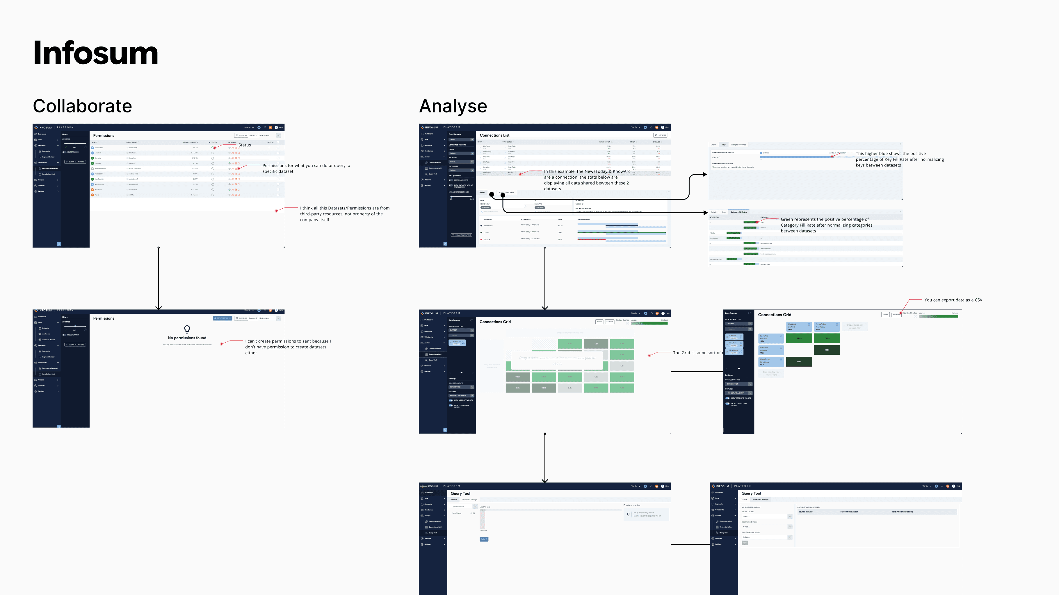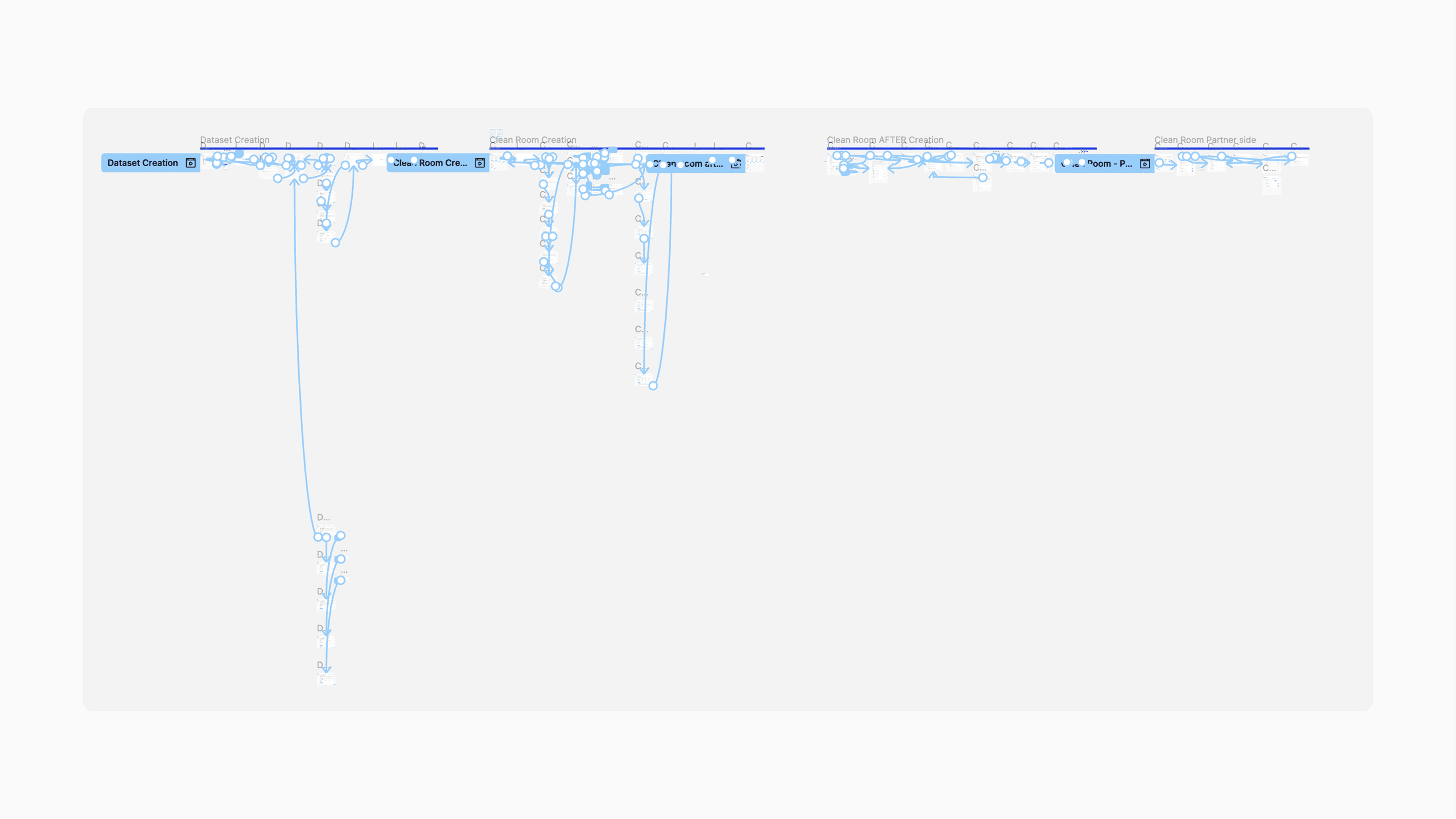 The platform was designed around four foundational experience areas that define how a data clean room operates: dataset creation, collaboration setup, connection configuration, and reporting. Each area represents a critical layer of the system, moving from secure data ingestion to privacy-safe analysis. Together, they form the operational backbone of the product while maintaining strict control over identity and access.