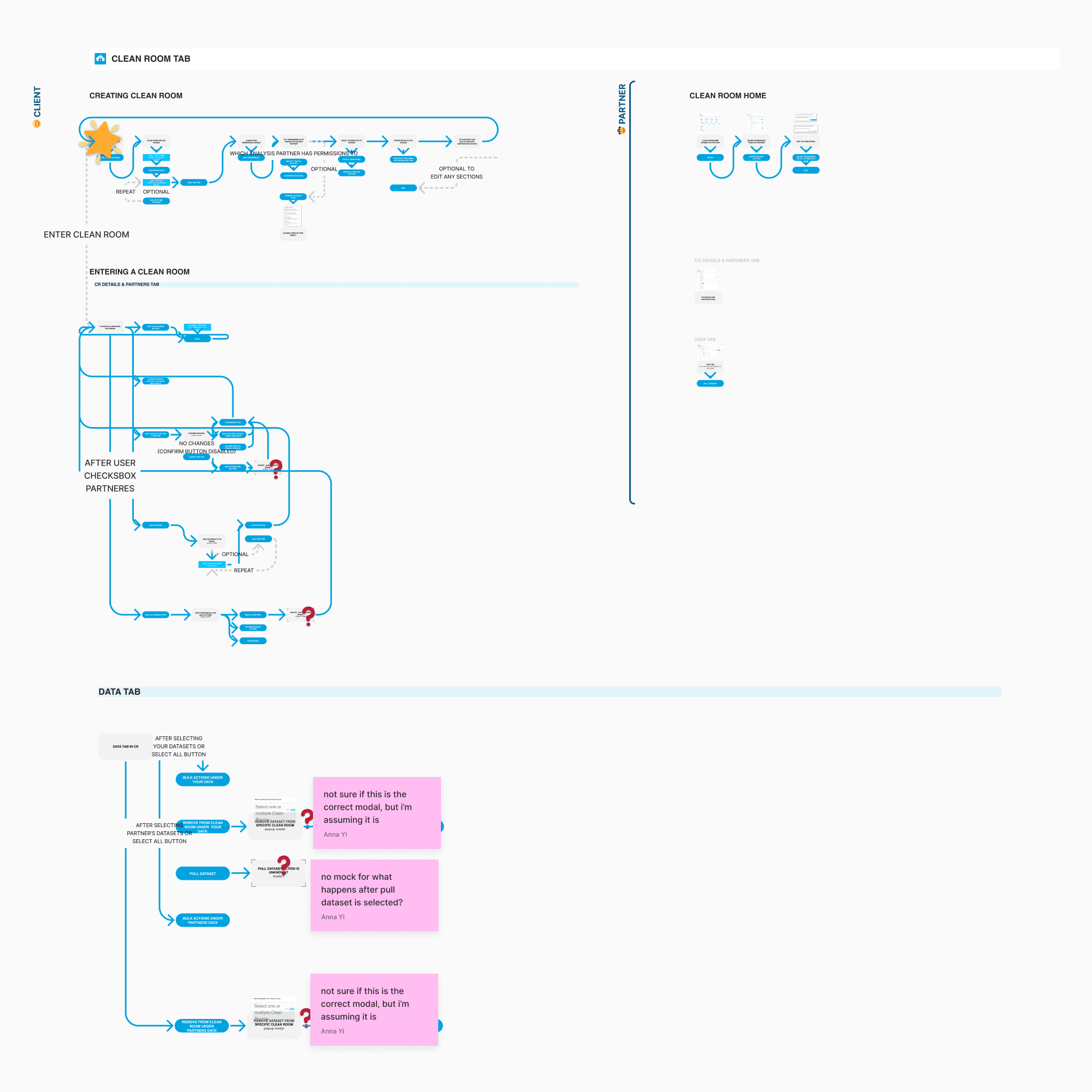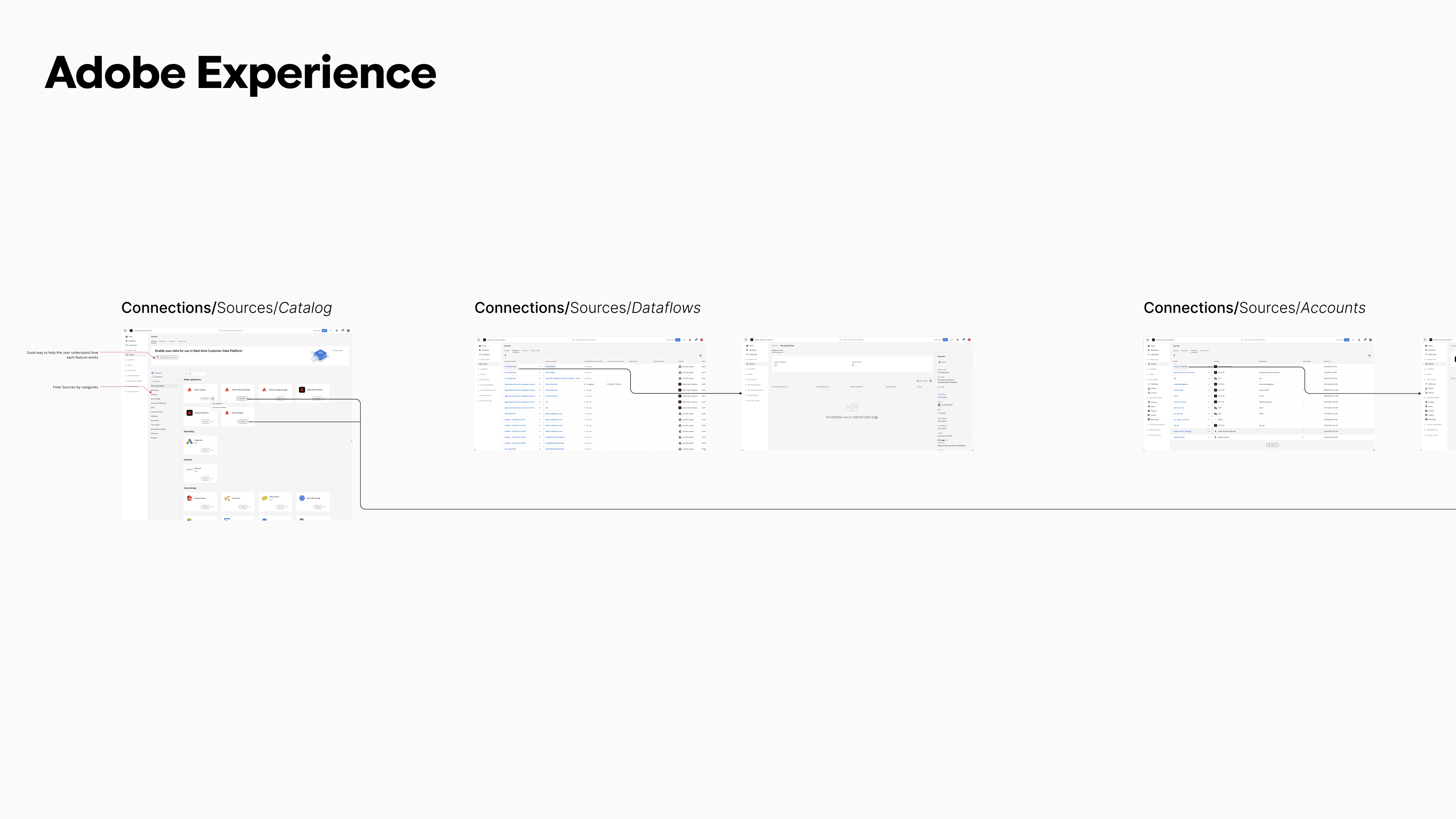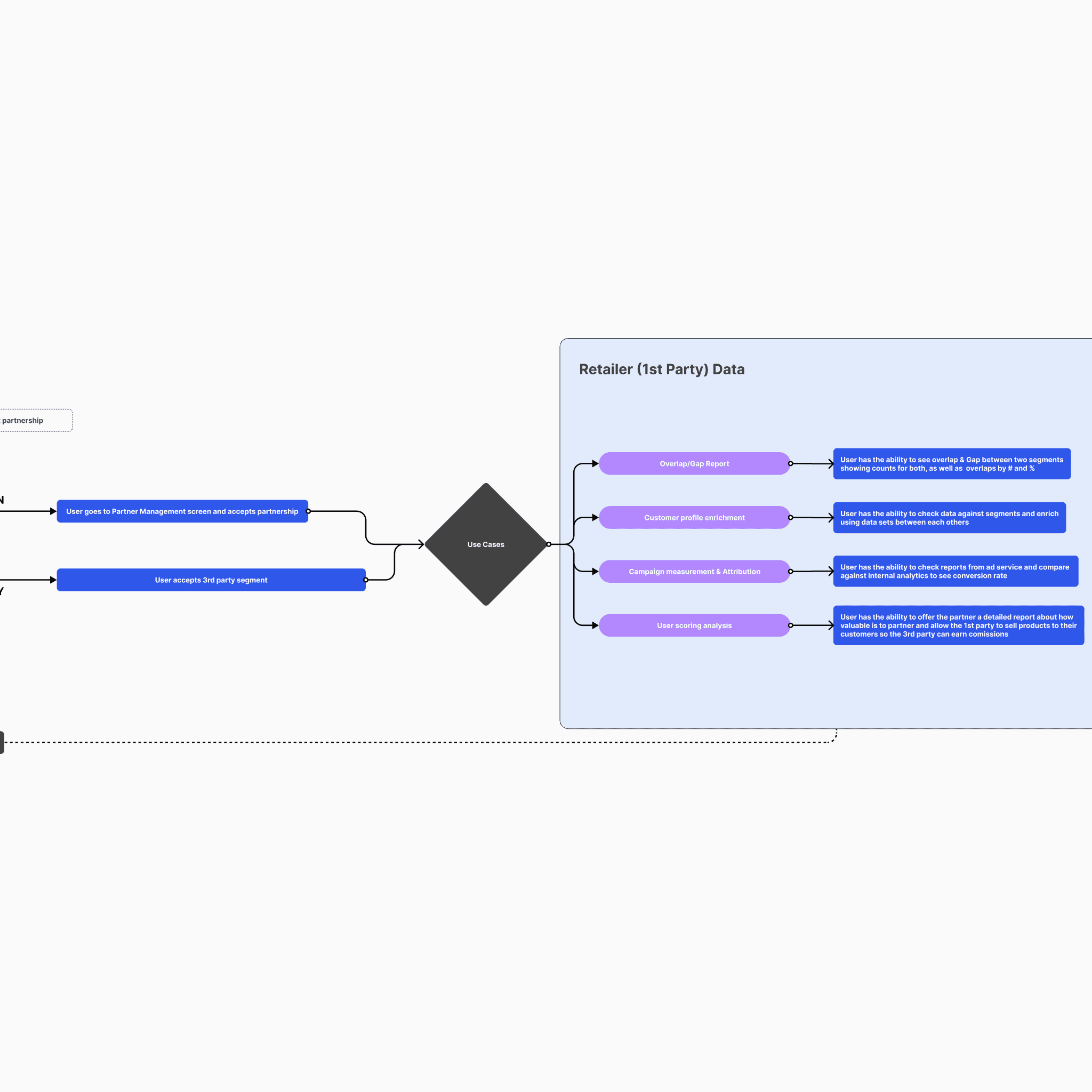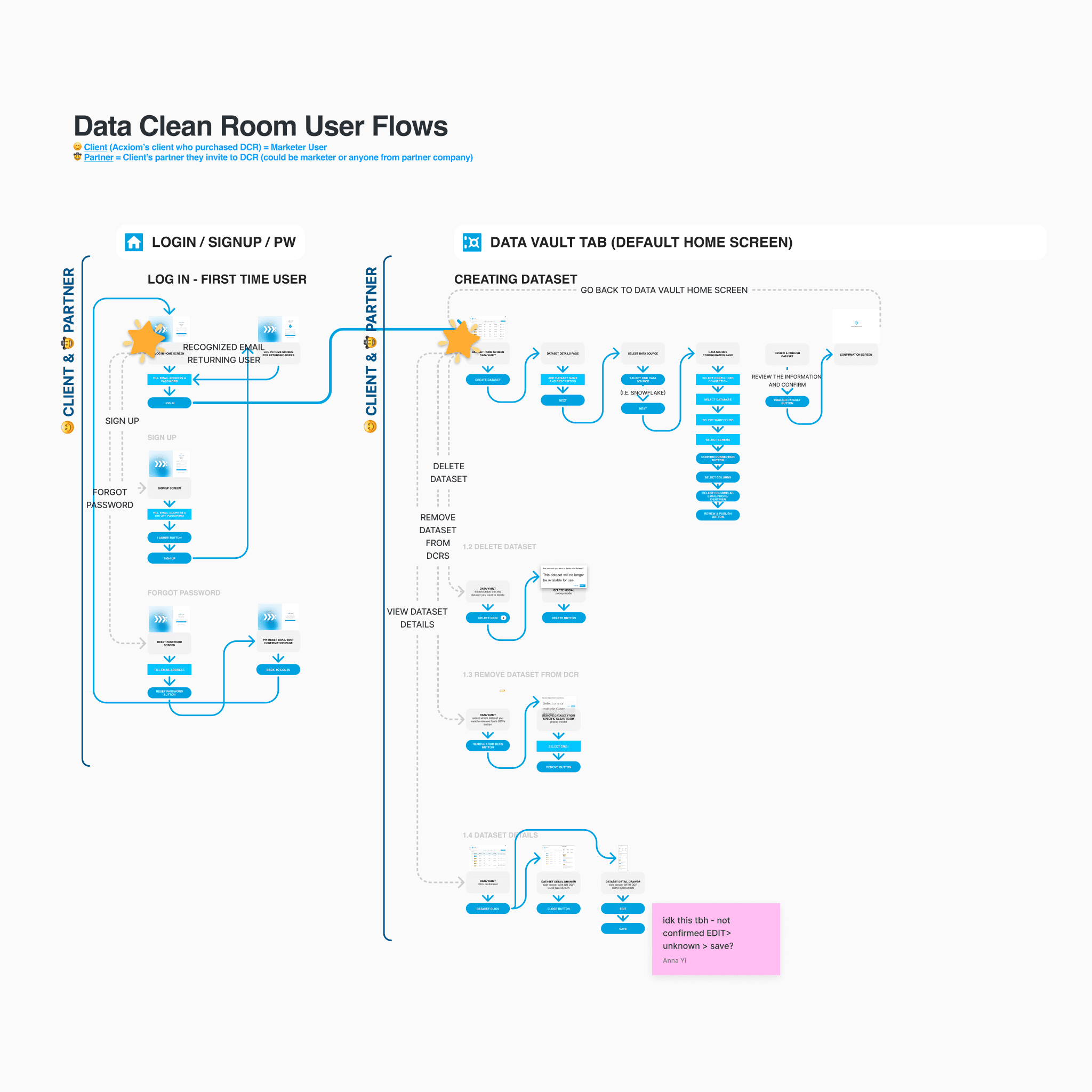 The platform was designed around four foundational experience areas that define how a data clean room operates: dataset creation, collaboration setup, connection configuration, and reporting. Each area represents a critical layer of the system, moving from secure data ingestion to privacy-safe analysis. Together, they form the operational backbone of the product while maintaining strict control over identity and access.