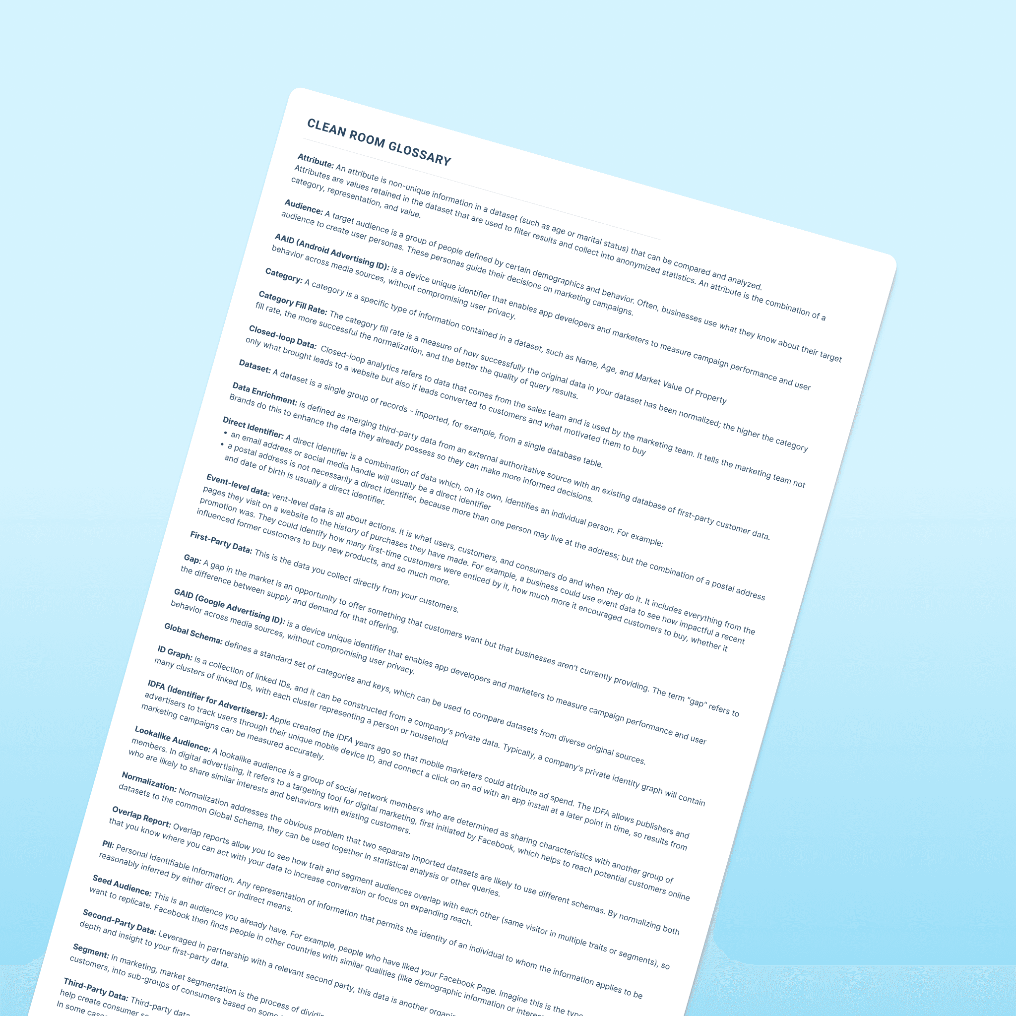 Key fill rate, normalization, direct identifiers, event-level data, ID graphs, AAID, IDFA, global schema, overlap, seed audiences, etc.